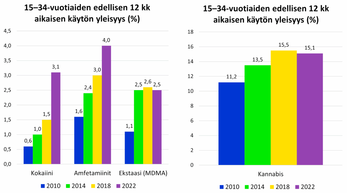 Suomessa huumausaineiden käyttö viimeisen vuoden aikana on yleisintä 15–34-vuotiaiden keskuudessa. 16 % heistä on käyttänyt jotain huumausainetta edellisen 12 kk aikana. Kun tarkastellaan 15–34-vuotiaiden edellisen 12 kk aikaista käyttöä ja vertaillaan sitä EU:n keskitasoon, on Suomessa kannabiksen ja MDMA:n käytön yleisyys hieman EU:n keskitason alapuolella. Kokaiinin käytön yleisyys on hieman EU:n keskitason yläpuolella ja amfetamiinien käytön yleisyys on yli kaksinkertainen EU:n keskitasoon nähden. Lisäksi voidaan tarkastella käytön yleisyyden kehitystä viime vuosikymmeneltä vuoteen 2022.