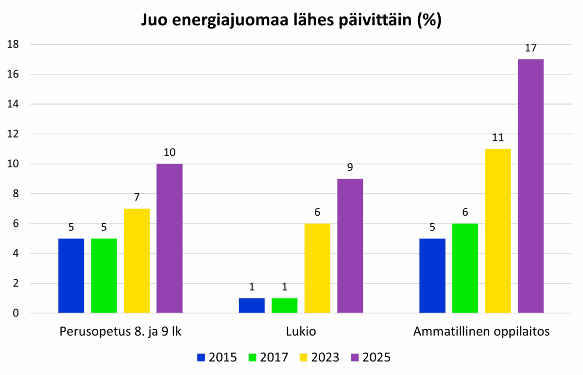 Myös energiajuomien lähes päivittäinen kulutus on noussut kymmenessä vuodessa 2–3-kertaiseksi, ja lukiolaisilla matalamman lähtötason takia vieläkin enemmän.