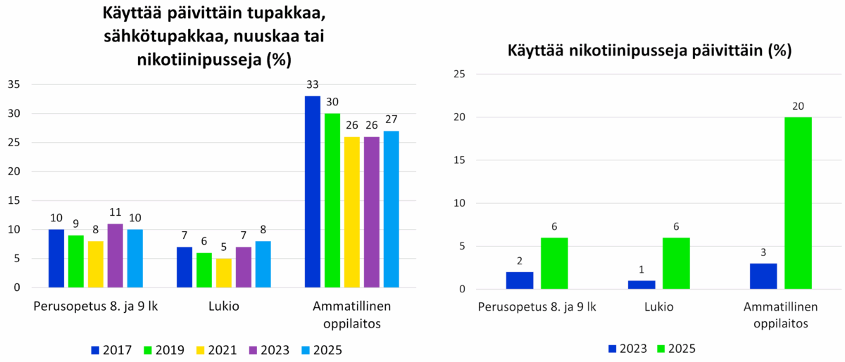Sen sijaan sähkösavukkeiden yleisyys vähintäänkin kaksinkertaistui vuonna 2023 ja tuli pääsääntöisesti hieman alaspäin vuonna 2025. Nikotiinipussien käytöstä on kysytty ensimmäisen kerran vuonna 2023 ja vuonna 2025 niiden käytön yleisyys vähintäänkin kaksinkertaistui ja ammattioppilaitoksissa päivittäisen käytön yleisyys kasvoi yli viisinkertaiseksi. Aika näyttää kääntävätkö uudet nikotiinituotteet pitkään jatkuneen hyvän kehityssuunnan nikotiinituotteiden käytön vähentymisessä vai jääkö nousu lyhytaikaiseksi.