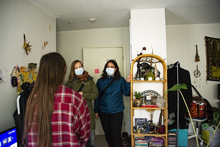 Oven avaa nuori nainen, joka antaa hymyillen luvan ottaa kohtaamisesta myös muutaman kuvan. Elina ja Krista kyselevät kuulumisia ja juttelevat hetken huonejärjestelystä ja huonekaluista, joista asiakas pääsee kohta eroon ja saa näin lisää tilaa asuntoonsa.