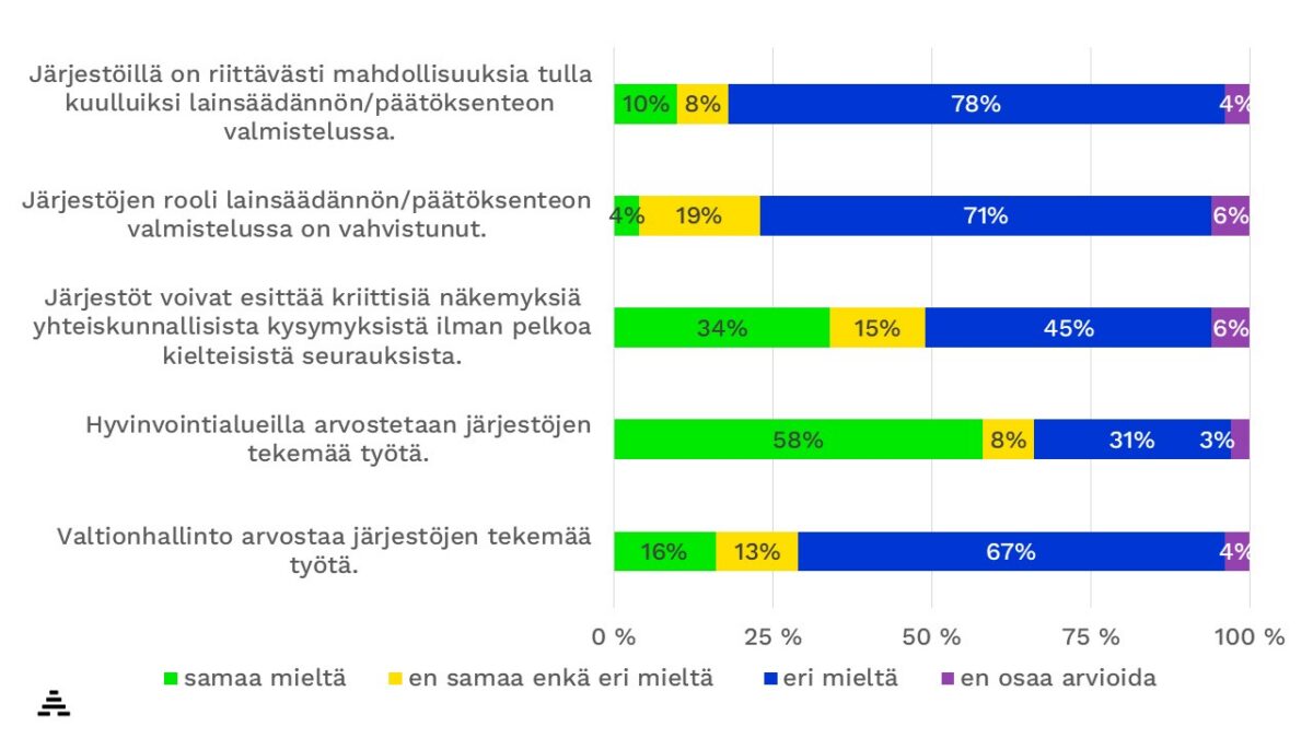 Lisäksi valtaosa vastaajista koki järjestöjen aseman tässä pikemminkin heikentyneen kuin parantuneen. 71 % vastaajista oli eri mieltä väittämästä, jonka mukaan järjestöjen rooli lainsäädännön ja päätöksenteon valmistelussa on vahvistunut. Vain muutama prosentti vastaajista oli samaa mieltä väittämän kanssa. Vaikutusmahdollisuuksien kaventuminen näyttää koskevan järjestökenttää hyvin laajasti.