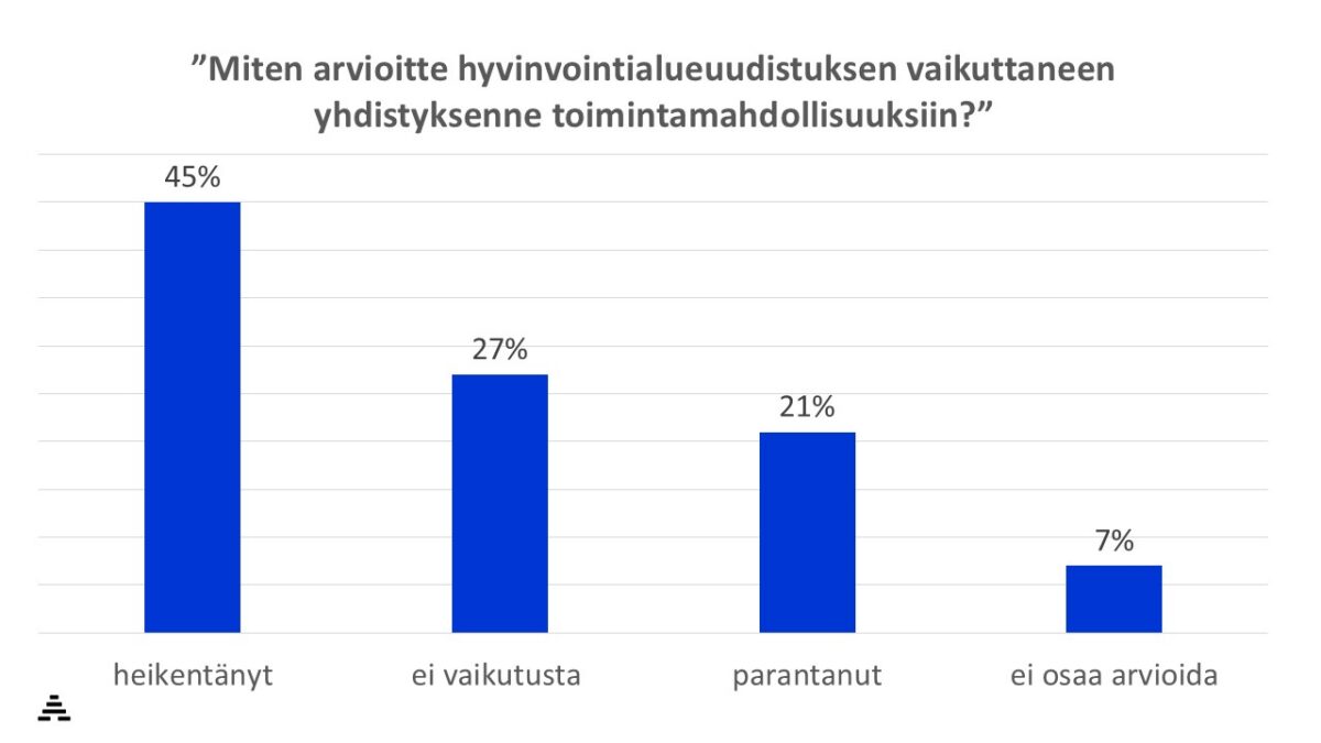 MIPA 2.0 -hankkeen tekemässä kyselyssä lähes puolet yhdistysjohdosta (45 %) arvioi hyvinvointialueuudistuksen heikentäneen yhdistyksensä toimintamahdollisuuksia, viidennes (21 %) parantaneen. Kielteiset kokemukset liittyivät useimmiten yhteistyön heikkenemiseen sekä avustusten ja ostopalvelujen vähenemiseen.
